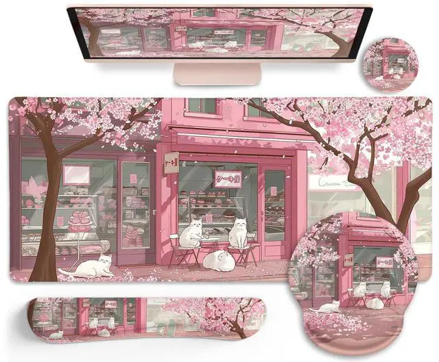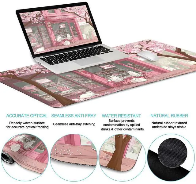 Cute and Stylish Design: The anime cat mouse pad set features an adorable design of white cats lounging under cherry blossom trees outside a Japanese dessert house. This feminine and cute design adds a touch of charm to your workspace