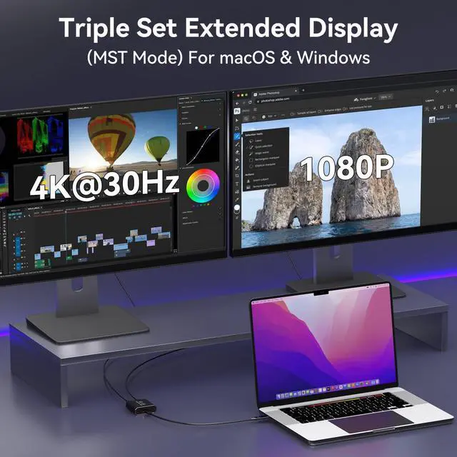 Note: 1.Before using the adapter, please install the driver correctly according to the included instructions before using the product normally. 2. Please use HDMI1.4 cables under 6Ft. Do not use conversion cables. 3. The product is professionally tuned for MacBook Air and Pro models with M1, M2, and M3 chips.4. USB-A ports support concurrent data transfer and video transmission capabilities