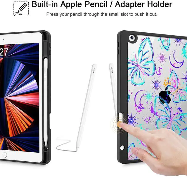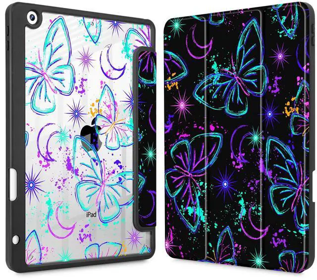 Mektron Printed Case for iPad 10.2 Inch 2021/2020/2019, for iPad 9th/8th/7th Generation Case, Buit in Pencil Holder with Shockproof Cover Clear Shell + Trifold Stand, Fantasy Butterfly