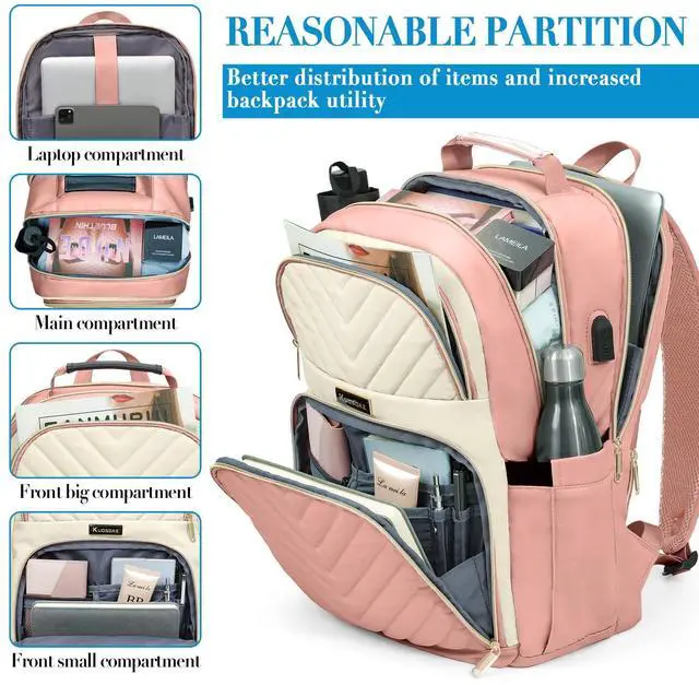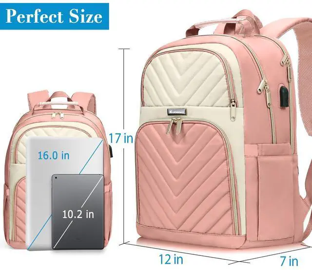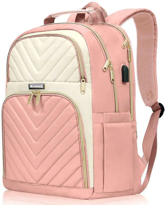Kuosdaz Backpack for Women, School Backpacks for Teen Girls, Stylish Cute Laptop Backpack, Teacher Student College Bookbags with USB Charging Port, Beige & Pink