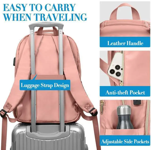 Fashion Pink & Gold Water-resistant Material: Pink backpack for women is made of fashion stitch texture polyester waterproof fabric and gold-plated zipper on the outside, and tear-resistant material on the inside for durability. The top of the Laptop backpack is equipped with a comfortable PU leather handle, which is easy to carry and adds a fashion feel.