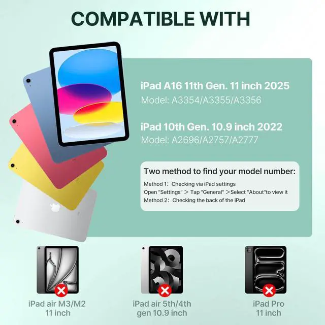 Compatible with iPad A16 Case with keyboard for iPad 11th generation 11-inch 2025 (Model: A3354/A3355/A3356), For iPad 10th generation 10.9-inch 2022 (Model: A2696/A2757/A2777). Not compatible with other devices, Please check your device's model number on the bottom carefully before purchasing, ensuring a perfect fit