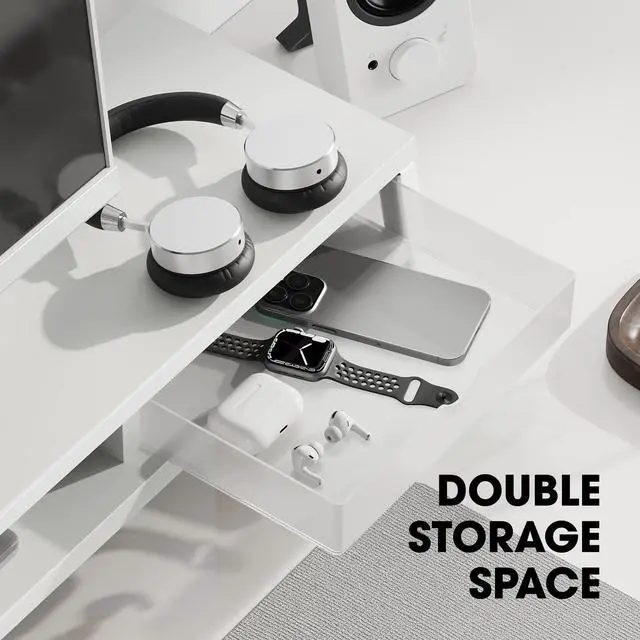 Spacious & Organized StorageFenge dual monitor stand with 3 compartments and 2 non-slip out frosted drawers (with rear baffles) for clutter-free workspace organization. The 1.9" bottom space securely stores keyboards, mice, or office supplies, maximizing desktop space.