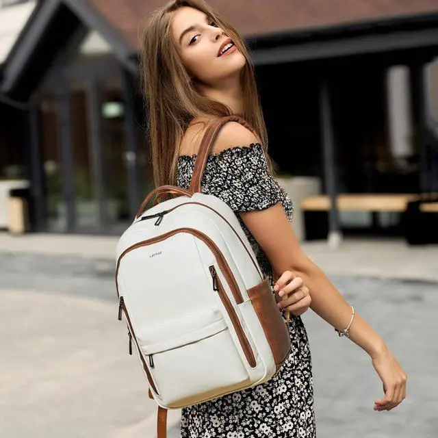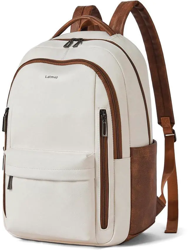 LATMAP 30L Backpack Purse for Women Men Laptop Backpack, Faux Leather Travel Work Backpack Teacher Bookbag fits 15.6" Laptop, Beige