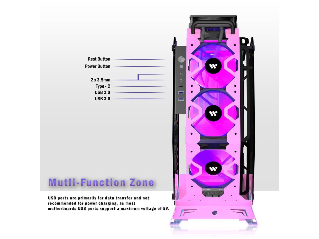 [Powerful cooling ]-- C570 PC case is pre-installed 5 PWM ARGB Fans. The unique open design can keep the GPU Temperature continuously low,making your computer work more smoothly.