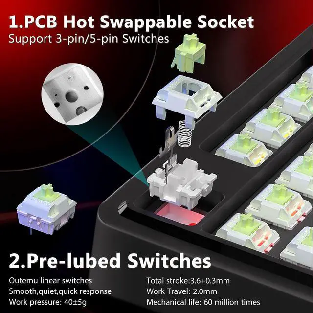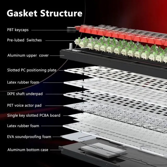 Gasket-Mounted Design for Premium Typing Experience: Engineered with a gasket structure and extended integrated silicone pad, this keyboard delivers a soft, elastic typing feel with enhanced stability. The PCB single-key slotting optimizes resilience, ensuring every keystroke is smooth and responsive. Five layers of sound-dampening material fill the gaps between the PCB, positioning plate, and switches, effectively reducing cavity noise and creating a solid, satisfying typing soundideal for both quiet workspaces and immersive gaming sessions.