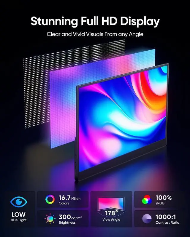 Brilliant Full HD Visuals: Enjoy crisp 1080P resolution with a vibrant IPS display and HDR support. The 178° wide viewing angle and 100% sRGB color accuracy bring your content to life from every angle