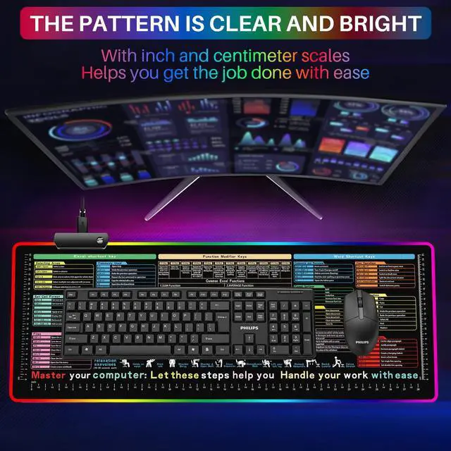 LARGE AND COMFORTABLE SIZE With its XL large size of 800*300*3mm (31.5*11.8*0.12in), this learn excel mouse pad cheat sheet offers ample space for your mouse and keyboard, making led mouse pad the perfect choice for office work, studying, and gaming. Our get excel pad for desk integrates essential office tools like Excel, Word,contains 12 types of common skills in excel and word, enhancing your proficiency. Multi-skilled professionals earn higher salaries, as studies indicate.