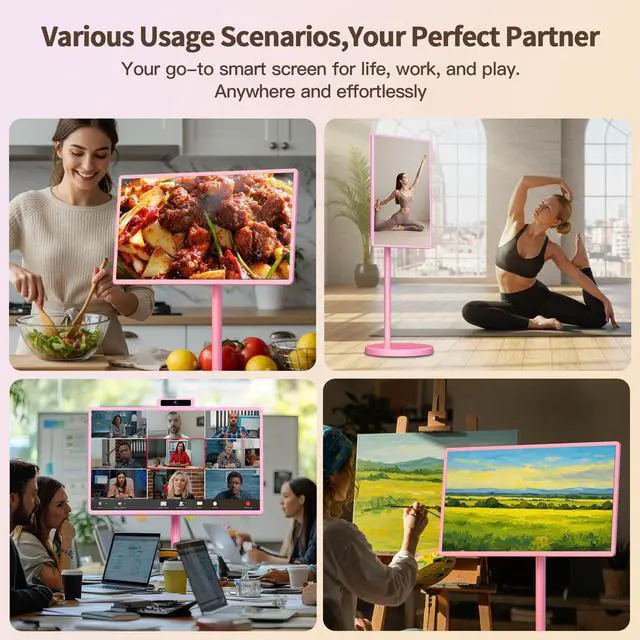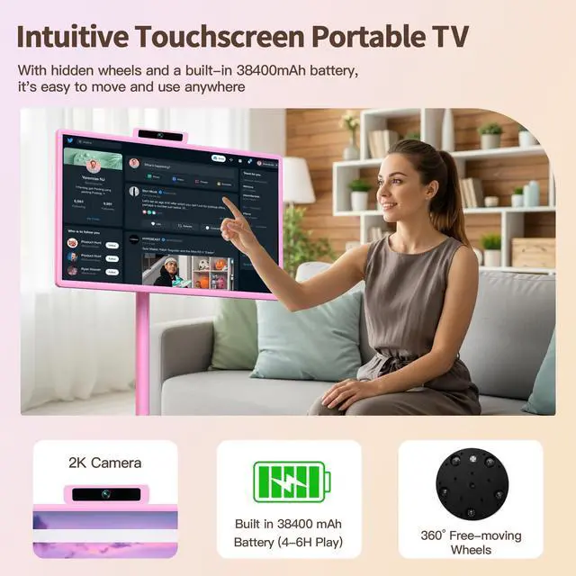 VLH 32 Inch Portable Smart TV, 1080P Touchscreen Android 15 Monitor on Wheels, 5MP Camera, 4-6H Battery, 8+128GB Storage, Voice/Airmouse Remote Control, Rotatable Display for Home/Office/Outdoor (Pink)