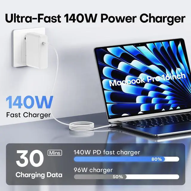 140W Super Fast Charging: Experience charging speeds that far surpass standard 96W and 70W chargersperfect for use with 14/16-inch MacBook Pro or 13/15-inch MacBook Air, reaching 60-80% charge in just 30 minutes. This high-efficiency, ultra-stable charging solution is engineered to keep up with the power demands of M1, M2, and M3 Pro Max chips, ensuring uninterrupted productivity
