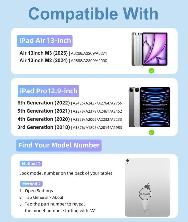 Compatibility: This keyboard case compatible with iPad Air 13 inch (M3) 2025 (Model: A3268, A3269, A3271), Air 13 inch (M2) 2024 (Model: A2898, A2899, A2900). Compatible with iPad Pro 12.9 inch 6th Generation 2022 (Model: A2436, A2437, A2764, A2766), 5th Generation 2021 (Model: A2378, A2379, A2461, A2462), 4th Generation 2020 (Model: A2229, A2069, A2232, A2233) and 3rd Generation 2018 (Model: A1876, A1895, A2014, A1983). Please check the model number starting with "A" on the back of your tablet before purchasing