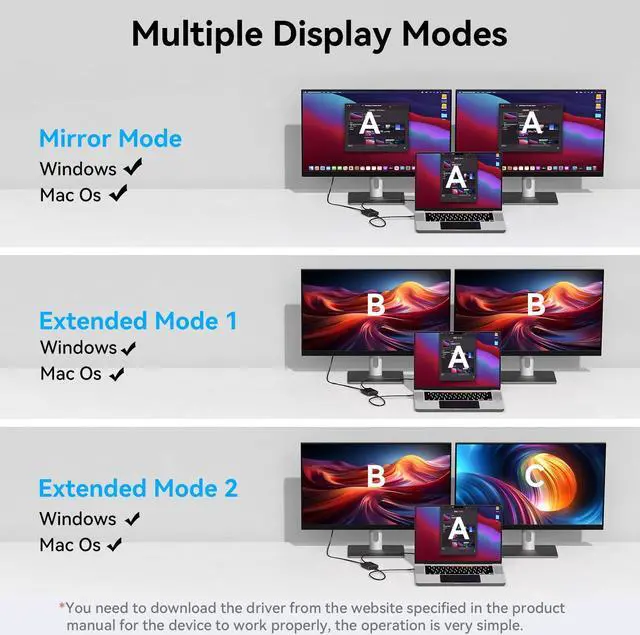 USB A or USB C to Dual HDMI AdapterThis versatile USB to dual HDMI adapter functions as an efficient HDMI splitter 1 in 2 out extended display solution, enabling seamless multi-monitor setups for both work and entertainment. Connect a single laptop or computer to two external monitors via USB-A or USB-Cports, delivering flexible extended display for dual monitorsor mirrored screen configurations.This HDMI dual monitor adapter supports USB 3.0 to dual HDMI connectivity and ensures broad compatibility with both Windows and macOS systems. (Note: Requires program installationplease follow the included instructions to set up the appropriate software for your operating system.)