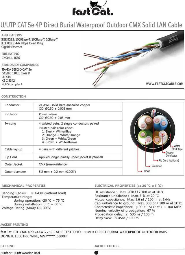 fast Cat. Cat5e Outdoor, 1000ft, Waterproof Direct Burial Rated CMX, Black 24AWG Solid Bare Copper, 350MHz, PoE+, UL Listed, Unshielded UTP, Bulk Ethernet Cable