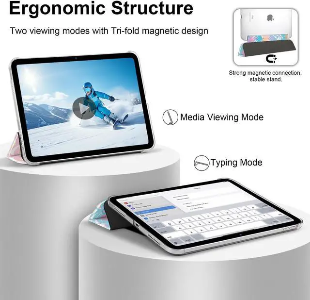 Magnetic protective cover automatically wakes iPad when open and hibernates when closed to conserve power. Tri-fold stand provides the perfect viewing and typing angle