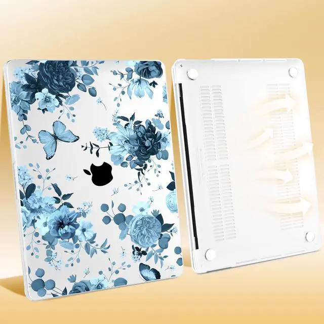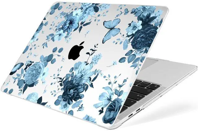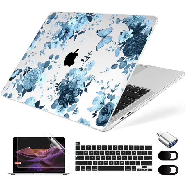 MecBevia Compatible with MacBook Pro 13 inch Case 2022 2021 2020 Release M2 M1 A2338 A2251 A2289, Plastic Hard Shell&Keyboard Cover&Screen Protector&Webcam Cover&Type-C Adapter, Blue Flowers