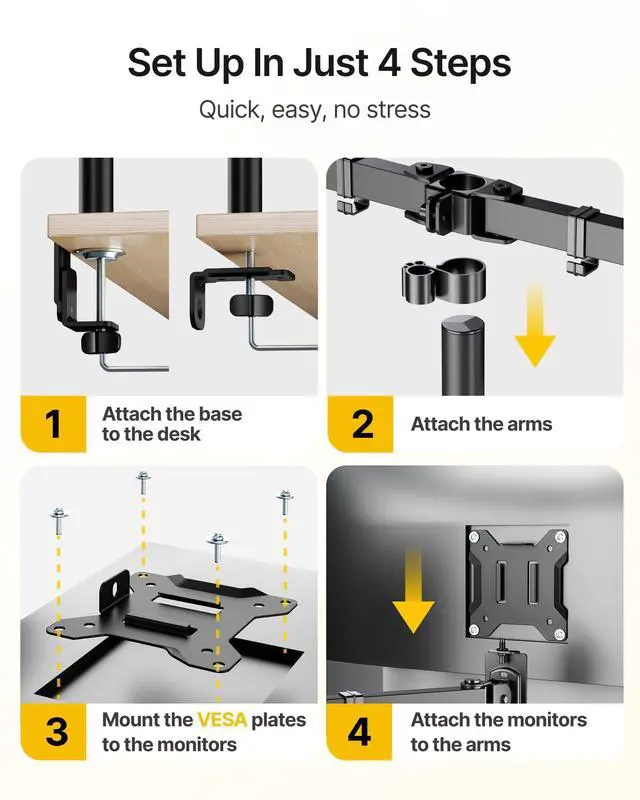 Save Desk Space: The quad monitor mount helps you declutter your desk and create more usable space. It also features integrated cable organizers to keep wires tidy and out of sight, enhancing your comfort during work, gaming, and entertainment.