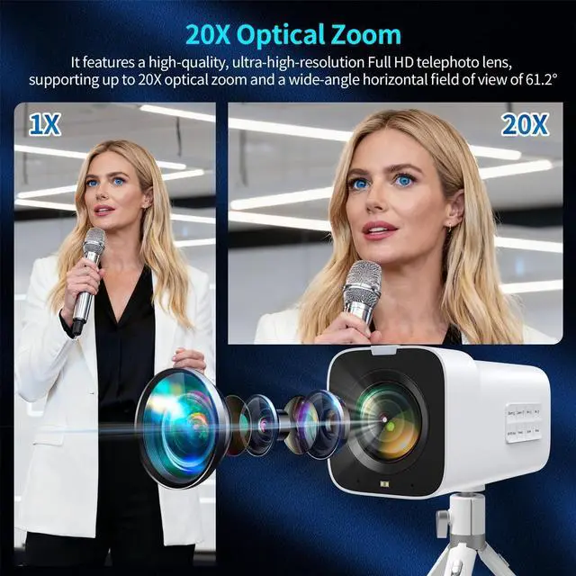 20X Optical Zoom plus 16X Digital ZoomEquipped with a high-quality and ultra-high-resolution full HD telephoto lens that supports up to 20X optical zoom and 16X digital zoom, while the horizontal field of view at the wide-angle end reaches 61.2°. Great features for large-scale live streaming scenarios, such as church live streaming, teaching live streaming, and video conferencing.