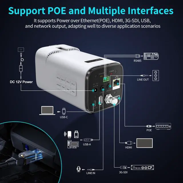 Support PoE and Multiple InterfacesIt supports Power over Ethernet(PoE), IP, HDMI, 3G-SDI, USB, and network output, adapting well to diverse application scenarios. HDMI and IP outputting video quality up to 4K@60FPS resolution, 3G-SDI outputting video streams at 1080P@60FP