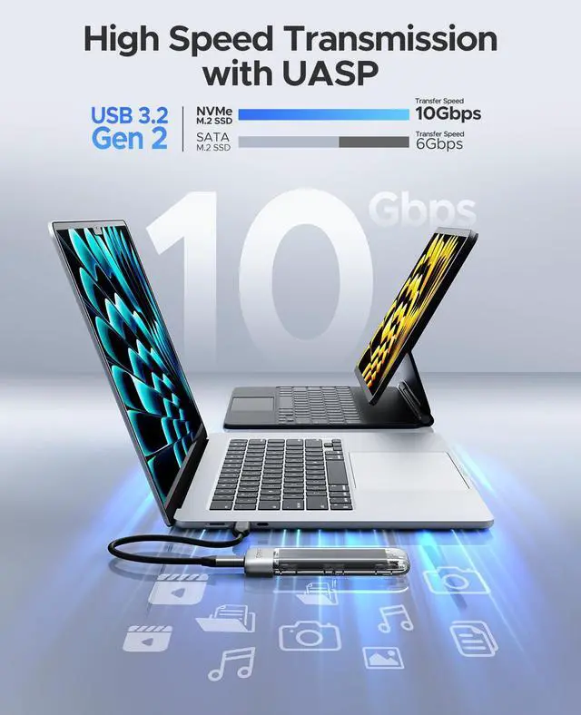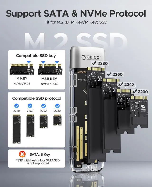 10Gbps/6Gbps High-Speed TransferORICO transparent NVMe enclosure uses the latest USB C 3.2 Gen2 interface with a transfer speed of up to 10Gbps (10Gbps for M.2 NVME protocol, 6Gbps for SATA protocol)