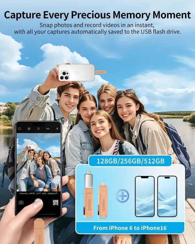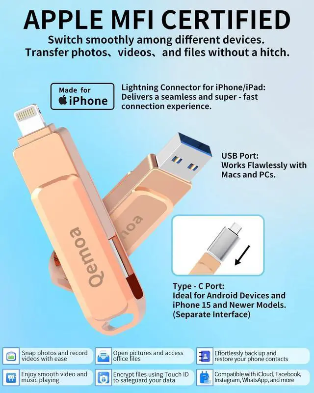 MFi Certification for Ultimate Security: This USB flash drive, specifically designed for iPhone, ensures the safety and stability of data storage with its MFi-certified quality and advanced chip technology. The sturdy metal shell provides comprehensive protection, being resistant to dust, shock, and high temperatures. The compact keychain design transforms this photo stick for iphone into a convenient accessory that you can carry around effortlessly, offering both portability and practicality!
