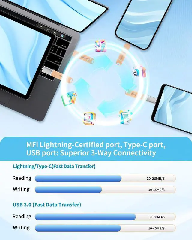 Ditch transfer hassles and enjoy seamless data flow: Our 3-in-1 flash drive photo stick, featuring USB, Lightning, and Type-C ports (with an adapter), enables one-click cross-device transfers between iPhones, iPads, Android devices, and computers. No more tangled cables or iCloud limits. Back up short videos and selfies instantlyjust plug and save. With a generous 256GB capacity, it solves memory issues on phones and iPads, allowing you to store precious memories and important files