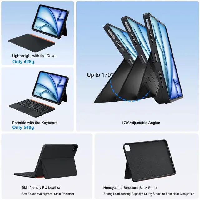 Magnetic 3 in 1 Design:Detachable magnetic keyboard case stand,strong magnets secure stable attachment.Instantly transforms iPad case into a typing keyboard or adjustable viewing stand.Suitable for movies,video calls and meetings.Ideal for office,travel,and outdoor adventures.PU Leather full-edge coverage,protects tablet from drops and scratches