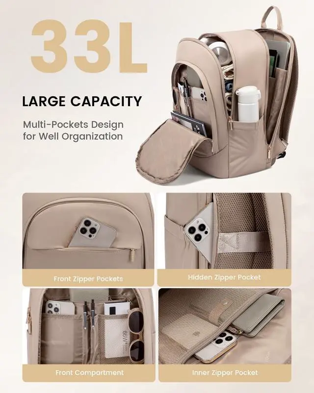 Large Capacity&Ample SpaceThis laptop backpack has a capacity of up to 33L for 17.3" laptop, perfect for women who need a backpack for work. The women's backpack is fit for holding daily supplies such as A4 folders,books, chargers, clothing, ideal for young women and professionals.