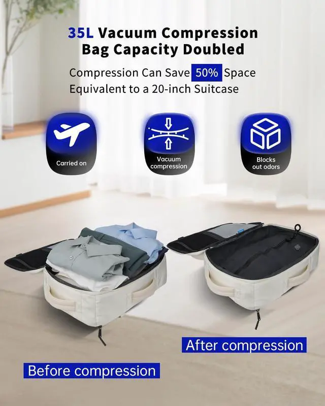 Vacuum bag Compression FeatureFeaturing an advanced airbag compression bag, this backpack maximizes packing efficiency with a total capacity of 35 liters. The airbag compartment is waterproof and securely sealed. To open, hold the circular ring with your left hand while pulling the zipper with your right, using both hands to pull apart in opposite directions.