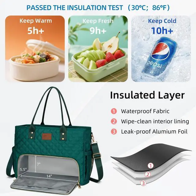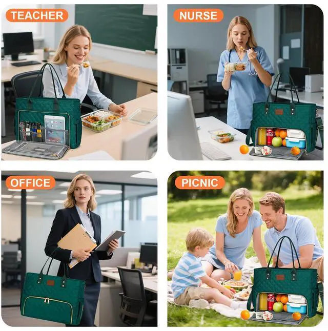 KKXIU Lunch Tote Bag for Teacher & Nurse, 15.6 Inch Laptop Tote with Insulated Lunch Box Pocket for Women, Professional Computer Work Bag for School, Office, Nursing - Green