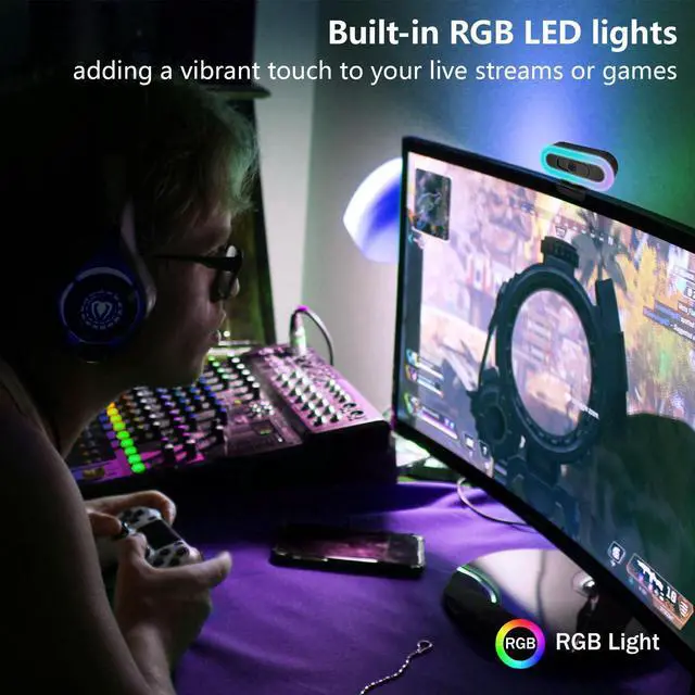 Webcam with Light & RGB LightingThis webcam with light offers three adjustable fill light levels. The computer camera for desktop includes RGB lighting to match your gaming vibe or personal style.