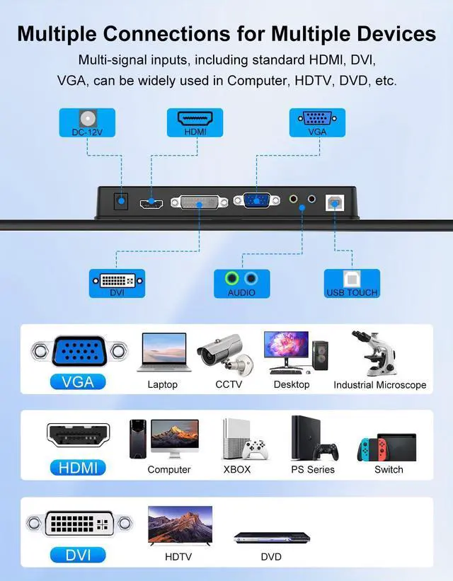 Versatile Connectivity - With Type-B(for touch function), HDMI, DVI and VGA ports, XBONFIRE touch screen display can easily connect to PC, Mini pc, Iaptop, Raspb Pi, POS, Kiosk, CCTV, Radio, TV boxes, industrial medical and other devices. Easily and stable connection, ideal for o