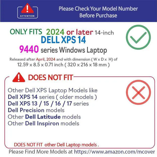 Designed to perfectly fit the 2024 or later 14.5" Dell XPS 14 9440 series Windows Notebook Computers with dimension of 12.59 x 8.5 x 0.71 inch ( 320 x 216 x 18 mm )