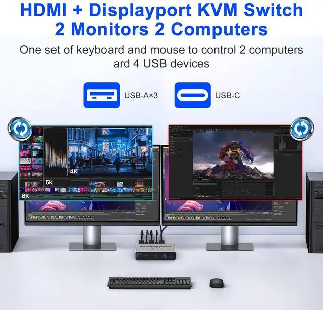 Dual monitor KVM Switches with Universal Compatibility: This advanced KVM switches 2 Monitors allows you to control two computers using one keyboard/mouse while sharing dual displays. To ensure proper operation: 1) Both computers must have HDMI+DP output ports plus USB-A port 2) Both monitors require HDMI/DP input ports 3) Use HDMI 2.1 cables under 6ft for optimal signal quality. Note: HDMI cables not included.