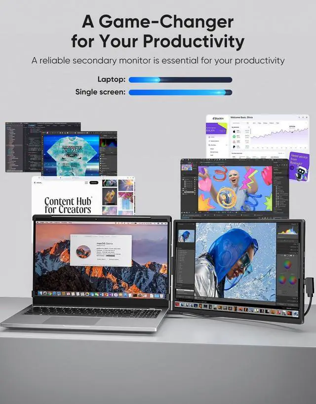 Boost Productivity by 200% On the Go: Due to a decent size, detachable and foldable design, Dopesplay dual screen monitor for laptop offers you fits easily into your travel backpack. Easy to carry and install. The vertical/ horizontal screen positions provide more convenience for your daily work. A must have for work travel if you are used to multiple screens