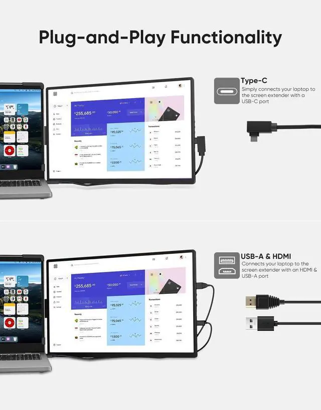 Plug and Play & No Software or Drivers: Setting up the monitor is a breeze. It connects seamlessly to your laptop with a single USB-C cable. 1 X USB-C to USB-C cable, 1 X USB-A to USB-C cable, and 1 X mini HDMI to HDMI cables. It's ready to go in seconds without the need for additional software or complicated configurations, which enhances user convenience