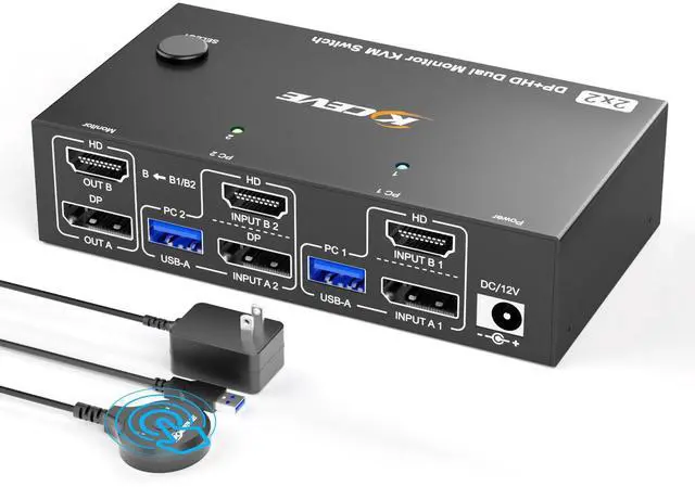 8K@60Hz HDMI+Displayport KVM Switch 2 Monitors 2 Computers, USB 3.0 KVM Switches Dual Monitor for 2 Computer Share 2 Monitor and 4 USB Ports, with Wired Remote, 12V Power Adapter and USB Cables