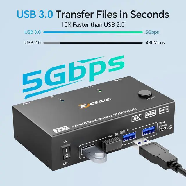. . . KVM Switch 2 monitors 2 computers with 4 USB 3.0 ports can be used to 2 PCs share USB devices,keyboard,mouse,camera,etc.The USB 3.0 transmission is more stable and faster--10 times faster than USB 2.0.A 12V power supply (included) is required when using high-power USB devices.