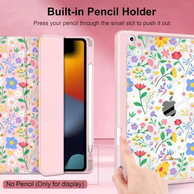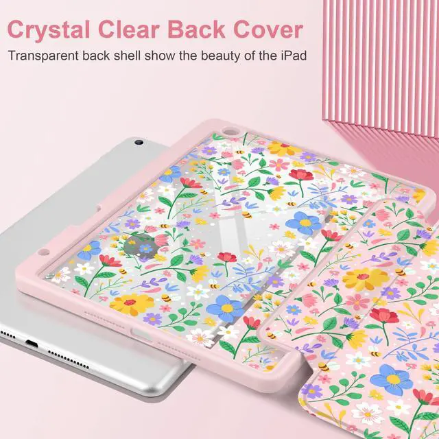 MEEgoodo Case for iPad 10.2 inch,Tablet Cases for iPad 9th Generation 2021/8th Gen 2020/7th Gen 2019 with Clear Acrylic Back Shell+Pencil Holder+Auto Wake/Sleep+Trifold Stand,Flat Spring Floral
