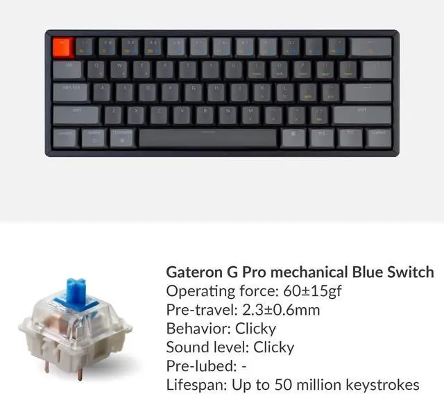 With the Gateron G Pro mechanical blue switch providing unrivaled clicky responsiveness with up to 50 million keystroke lifespan. N-key rollover (NKRO) on wired mode or 6