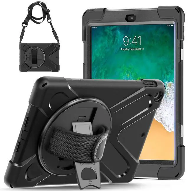 iPad 6th 5th Generation Case, TSQ iPad 9.7 2018 2017 Case Cover For Kids, Heavy Duty Durable Drop Shock Proof Rugged Protective Case With 360 Stand, Hand Strap&Shoulder Strap, A1893/A1954/A1822/1823 Black