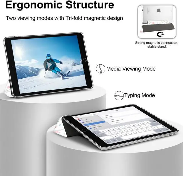 Magnetic protective cover automatically wakes iPad 10.2 when open and hibernates when closed to conserve power. Tri-fold stand provides the perfect viewing and typing angle