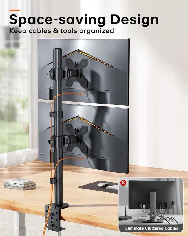 [Saving Desktop Space]: The VESA monitor mount can help free up desk space for your laptop, keyboard, and other office essentials. Neatly route wires using the integrated cable management clips to create a tidy, clutter-free workspace