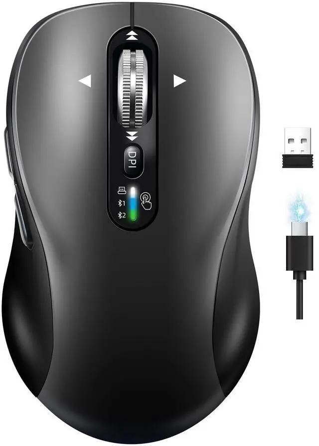 Seamless Multi-Device ConnectivityPlug&Play, the INFINMIND Wireless Bluetooth Mouse features 2*Bluetooth channels and a 2.4GHz USB receiver, allowing you to effortlessly switch between 3 Devices with a single button click. The integrated White, Blue, and Green LED indicators confirm active connections for 2.4G USB, Bluetooth Mode 1, and Bluetooth Mode 2 respectively, ensuring consistent, reliable, and convenient multi-device connectivity. (The 2.4GHz USB receiver is stored conveniently under the Magnetic Surface Coversimply remove it when needed. )