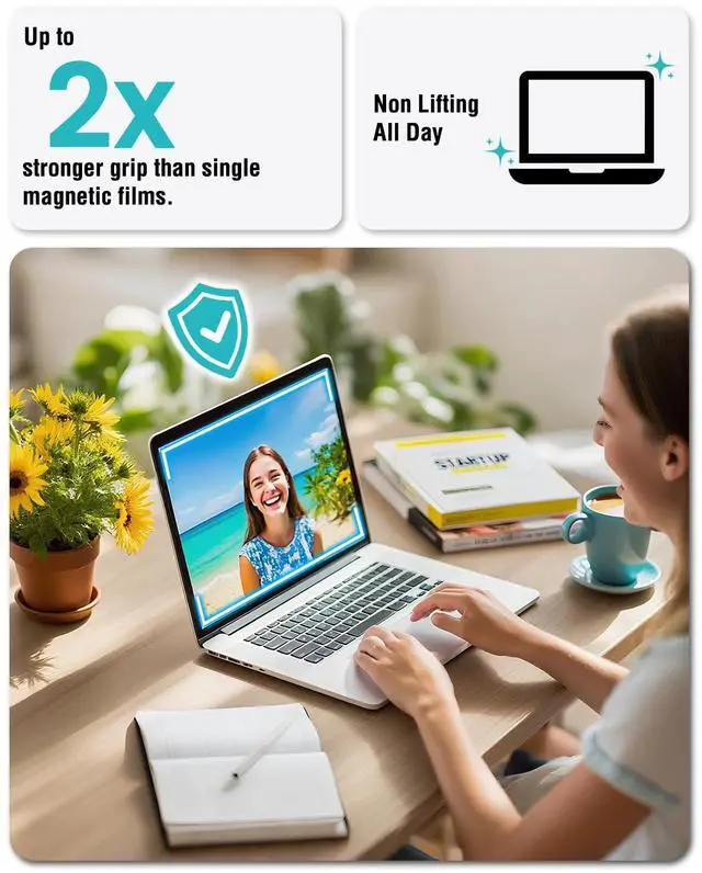 No More Peeling Corners Holds Strong Daily. Magnetic top + removable silicone grips hold firmly on laptop screens No lifting corners during flights or car rides, leaves zero glue marks when removed