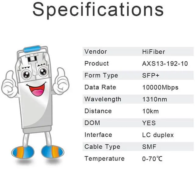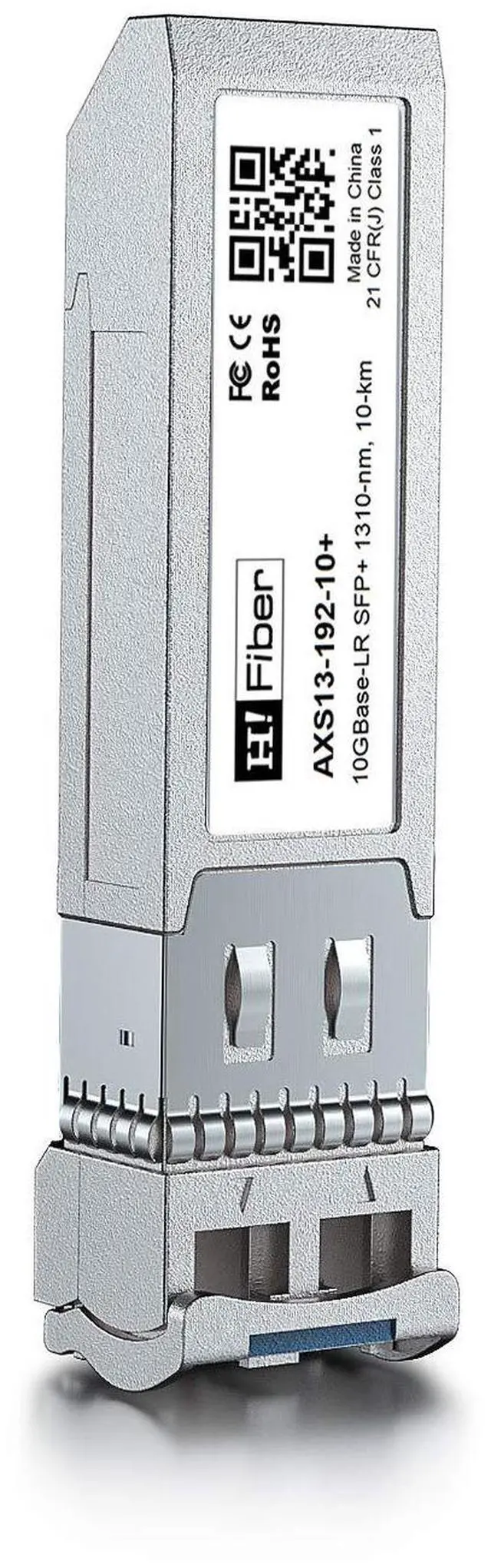 10G SFP+ Module: 10 Gigabit Ethernet Single Mode SFP+ Module, 10 Gb/s, 1310nm wavelength, Dual LC, SMF, operates on multi-mode fiber cable (OS2) spans of up to 10km in length.