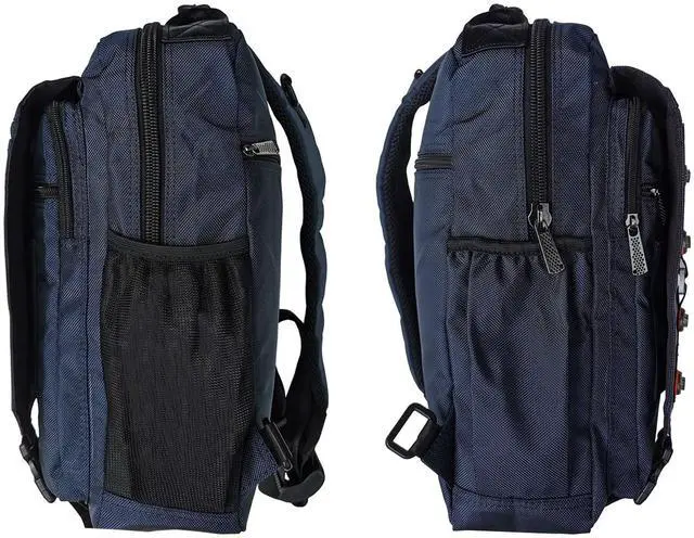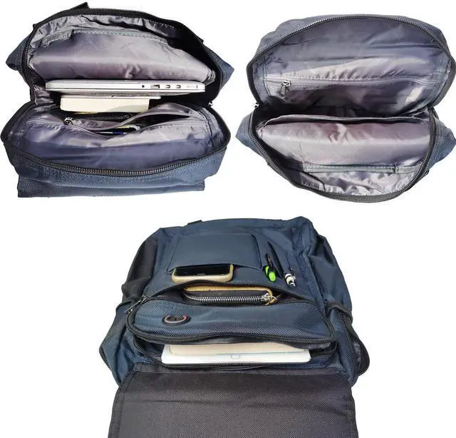 The compact, functional and durable laptop backpack is being manufactured by high quality water resistant nylon. Multi main compartment with many inside pockets easy to fit your various items. There is a laptop compartment inside the main pocket. It can hold up to 15 inch laptop. The shoulder strap is adjustable, it's wide and thickly padded with air mesh that can help you wear comfortably. It has every pockets you need.