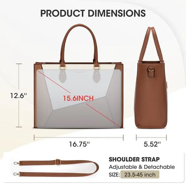 Women's Briefcase: Size of the laptop bag is 16.75 '' x 5.52 '' x 12.6 '' (L*W*H), finished with a secure zip-top closure. With a removable shoulder strap varies from 27.9 inches to a maximum of 49.2 inches and adjustable handles, you can be carried in several ways as a ladies' briefcase, teacher tote bag, computer bag for women or messenger bag, work bag as well, convenient and comfortable. ^^ Perfect Gift for