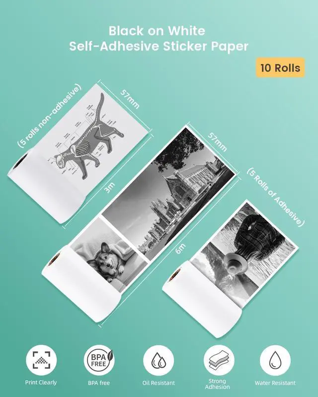 BORN4SHIP Fifteen Rolls Thermal Paper, 9 Rolls of self-Adhesive Thermal Paper and 6 Rolls Non-Adhesive Thermal Paper + 1 Sticker Printer - for Study Notes/DIY/Journal/Travel/Photo