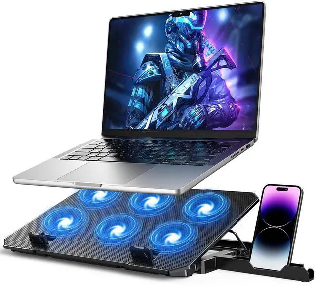 Comfort & Adjustable Height: This ergonomic laptop cooling stand doubles as a reliable gaming laptop cooler, operating on 5V/ 3.5W 5.5W for energy-efficient, steady cooling. It offers 5 height settings to tailor your ideal angle, easing neck and back fatigue during long gaming or work hours. The versatile cooling pad for laptop is also a thoughtful gift choiceperfect for back-to-school season, Fathers Day, or surprising friends, family, or colleagues. ^^ Non-Slip Baffles & Built-in Phone Stand: Dual anti-slip baffles keep your laptop firmly in place, even at sharp angleskeeping it stable through intense gaming sessions. A built-in phone holder on the right base lets you easily access game guides or chats, keeping key info visible without distraction. More than just a laptop cooler or high-performance laptop cooling pad, its also an ideal laptop stand for versatile gaming setups.
