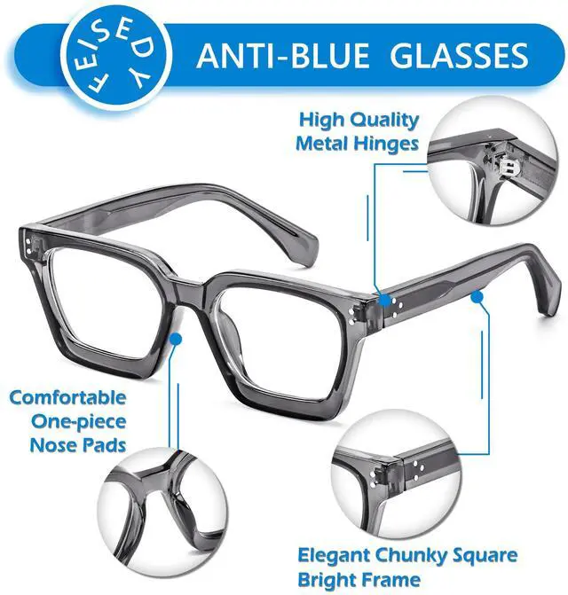 Anti Blue Ray & Replaceable LensesThis is an anti blue light glasses, provides eye health protection for peoples who work with computer mobile phone or other digital equipments, and for who watch TV often. It can relieve the eyestrain symptoms of prolonged computer blue ray exposure, and avoid the appearance of myopia. ^^ Fashion Square Chunky Frame These anti-blue glasses are not only stylish but also chunky. It subverts the traditional nerd plastic frame design. The new style clear glasses will put you in the spotlight all the time! ^^